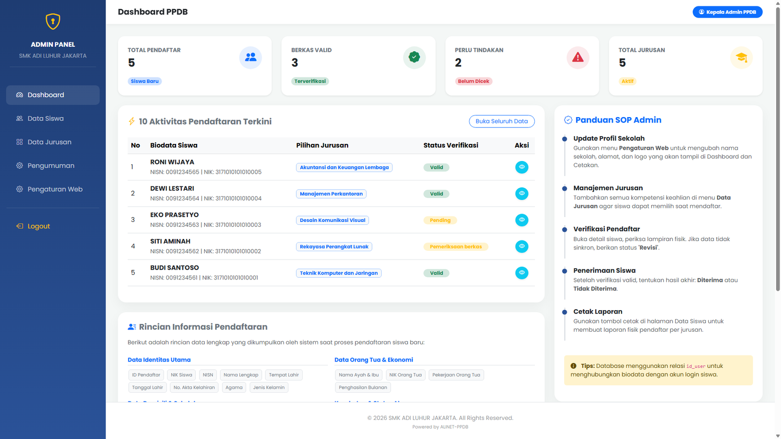 Implementasi sistem kendali terpusat yang memudahkan panitia dalam mengelola ribuan data pendaftar dengan tingkat akurasi dan keamanan yang tinggi.